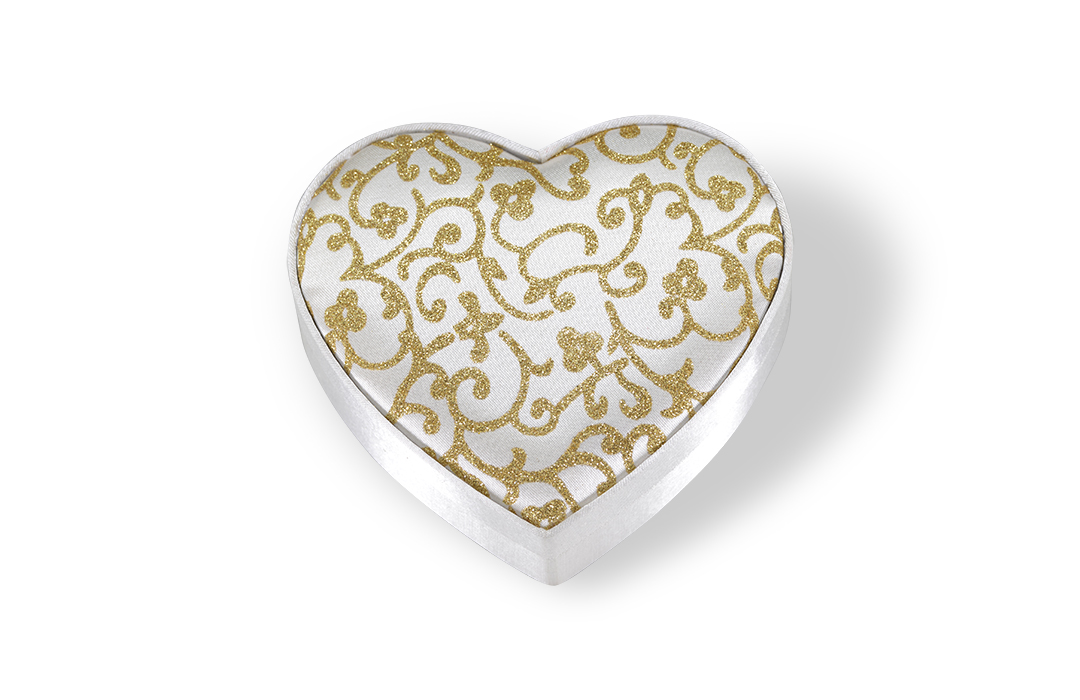 Kalp şeklinde, saten kumaş kaplı çikolata kutusu farklı ölçülerde hazırlanabilmektedir.
