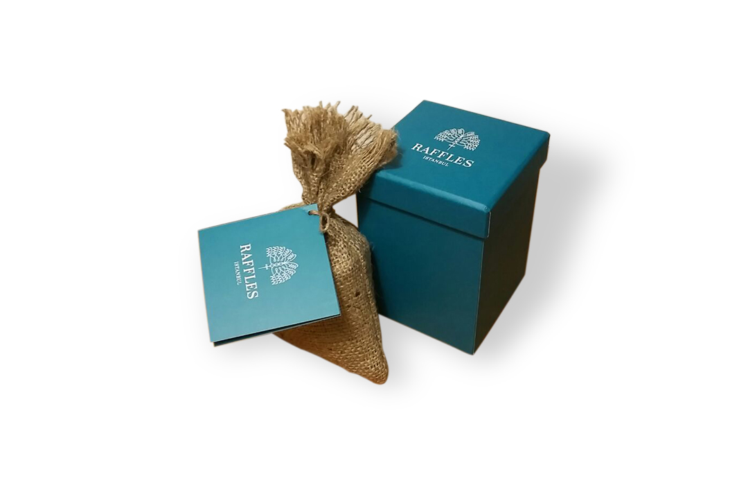 İçinde Türk Kahvesi bulunan özel dikim çuval, taslama kutu içinde Raffles İstanbul müşterilerine armağan edilmiştir.
